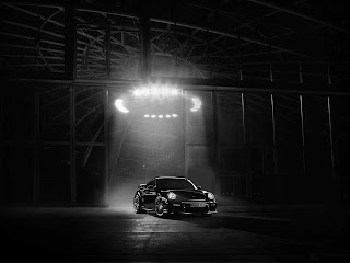 Zwart wit wallpaper met zwarte dure auto op industrieterrein |