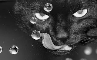 | Zwart wit foto met zwarte kat met lange tong en druppels |